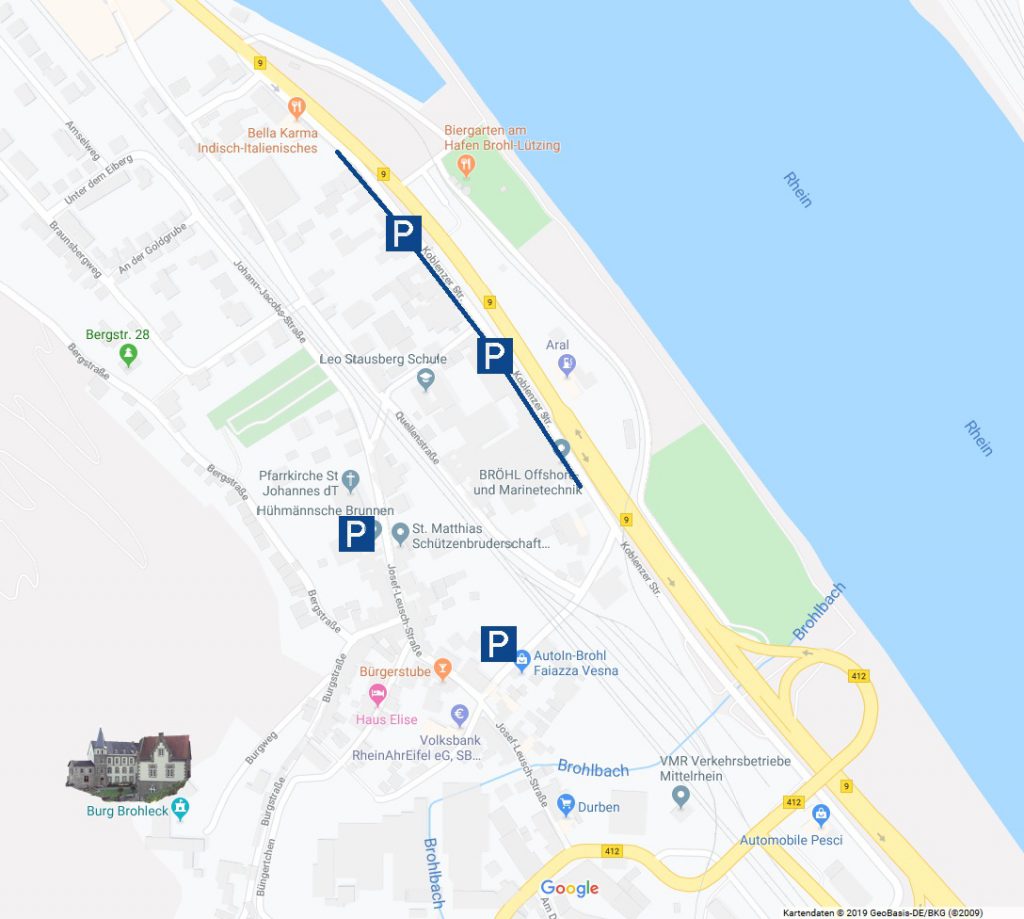 Da auf dem Gelände der Burg leider nur begrenzte Parkmöglichkeiten vorhanden sind, muss zum Teil auf entferntere Parkplätze ausgewichen werden. Nachfolgend eine Übersichtskarte mit öffentlichen Parkplätzen im Ort: